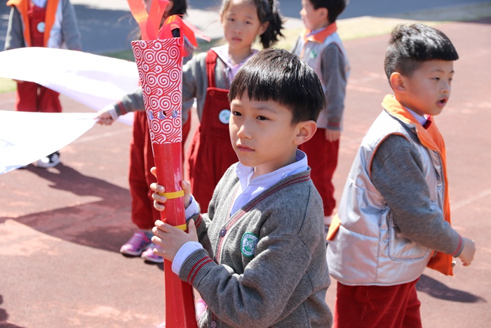 开幕式上最亮眼的还有火炬传递仪式。作为奥运会的前奏,圣火象征着勇敢和光明。在了解到火炬传递的意义后,17个班级的小小火炬手和护旗手一上场便精神抖擞、蓄势待发。